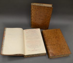 Bruslons, continué sur les Mémoires de l'Auteur et donné au public par M. Philémon-Louis Savary, nouvelle édition. Paris, Estienne et fils, 1748. 3 volumes in folio, texte sur 2 colonnes. Veau fauve marbré d'époque, dos à nerfs ornés, dos à nerfs ornés, tranches marbrées. (2 coiffes usagées). Manque le tome 4 (rare complet) consacré à la description de l'état du commerce par pays.