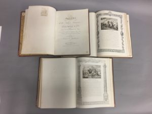 interfoliés ; 1 titre, 1 titre gravé, 65 planches gravées, 66 ff. interfoliés, (3) pp. de tables ; reliés demi-maroquin rouge à grains longs à coins, dos lisses ornés, tranches dorées. (quelques rousseurs marginales, frottements sur les coins, une coiffe arasée). Deuxième édition de cet important recueil d'estampes de grand luxe comportant 206 planches gravées à l'eau-forte, accompagnées d'un texte explicatif calligraphié et gravé au-dessous de chaque gravure, dans un encadrement de motifs. Cette seconde édition parue sous la Restauration fut honorée des souscriptions du roi Louis XVIII, et "des Empereurs, Rois, Princes, et principaux personnages de l'Europe." Si bien que l'ouvrage exalte aussi les actions de Wellington à Waterloo ou l'entrée du duc d'Angoulême à Bordeaux en mars 1814. La plupart des planches reproduisent celles de l'édition précédente.