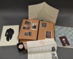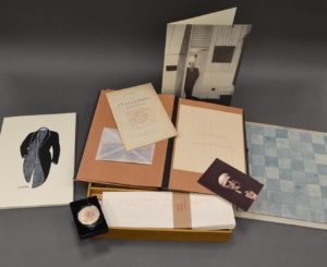 mm) ; -Un portfolio 340 x 240 mm à 11 soufflets contenant de nombreuses reproductions des œuvres de Duchamp, une paire de lunette bidimentionelles et le livre de H. VUIBERT, Les Anaglyphes Géométriques, etc.; -Un recueil 340 x 240 mm d’articles d’André Breton et Arturo Schwarz sur Marcel Duchamp couverture illustrée de la jaquette de Duchamp; -Une cassette audio présentant une interview et une lecture de texte, sur le boitier reproduction en caoutchouc et format réduit du Sein qui ornait l’édition de tête du catalogue de l’exposition surréaliste de 1947 ; - Photo de Duchamp à l'âge de 85 ans ; - Une double page in-4 illustrée d'une photographie de M. Duchamp, contenant les références précises de la boîte. Édition limitée à 850 exemplaires (N° 068).