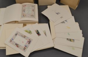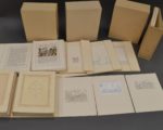 couvertures et les chemises). Un des 30 exemplaires sur vélin pur fil de Rives (n° 58) enrichis d’un dessin original par volume (3 dessins sous passe-partout), d’une suite en couleurs, d’une suite en noir et de la décomposition d’une planche (3 décompositions : une par volume).