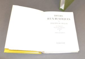[LEUQUET]. BELLAY (Joachim du). Divers jeux rustiques. Gravures au burin de Paul Leuquet. Paris, Vialetay, 1961. In-4 en feuilles, couverture rempliée, chemise et étui. (quelques rousseurs claires sur le f. de titre, la justif., et les ff. de...