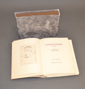 [PRASSINOS]. APOLLINAIRE. L'Hérésiarque. Pointes sèches de Mario Prassinos. Paris, Stock, 1945. Petit in-4, en feuilles, couverture rempliée illustrée, étui. Couverture, frontispice et 11 planches hors-texte à la pointe sèche de Mario...