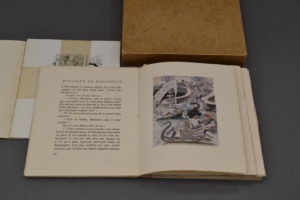 pochoir. Tirage limité à 1000 exemplaires, un des 325 exemplaires sur vélin de chiffon enrichis d’une illustration originale aquarellée (originale de l’illustr. page 63) et d’une suite en noir des illustrations.