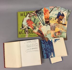 dont cartes en couleurs, relié percaline rouge éditeur, dos lisse orné, vignette au dragon au centre du plat supérieur. (JOINT) : Angkor. Paris, Editions Tel, 1931. In-folio en feuilles. – (JOINT) : Visions d’Orient. 12 menus vierges sur double feuillets illustrés en couleurs, sous chemise à rabats, des champagnes Charles Heidsieck, vers 1930. – (JOINT) : GROUSSET & AUBOYER. De l’Inde au Cambodge et à Java. Monaco, Les Documents d’art, 1950. In-4 reliure éditeur, jaquette. Tirage numéroté sur papier hélio ivoiré. Les 4 ouvrages :