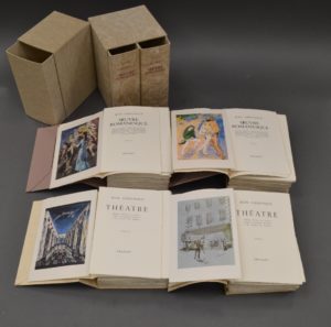 in-8 en feuillets, chemises rempliées dans un même étui. Tirage limité, 1 des 205 exemplaires numérotés sur vélin de Rives (n°169). GIRAUDOUX Jean. Théâtre. Paris, Grasset, 1954. 2 volumes in-8 en feuillets, chemises rempliées dans un même étui. Illustré d'après les maquettes de décors et de costumes des créations : Bérard, Cipra, Cassandre, Moulaert, Leyrits, Andreu, etc. Tirage limité, 1 des 220 exemplaires numérotés sur vélin de Rives (n°38).