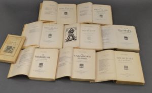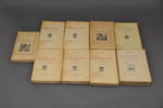 Jerry dans l’Ile, 1922. 1/20 Lafuma. – Les Mutinés de l’Elseneur, 1930. 1/75 vélin teinté Lafuma. – La peste écarlate, 1924. 1/75 vergé pur fil Lafuma. – Croc blanc, 1923. 1/25 vergé Lafuma. – Le talon de fer, 1923. 1/15 vergé Lafuma. – Michael chien de cirque, 1929. 1/150 vélin du Marais. – Le fils du loup, 1920. 1/40 pur fil Lafuma.