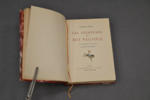 LOUYS (Pierre). Aventures du Roi Pausole. Illustrations en couleurs de Jacques Touchet. Paris, Piazza, 1939. In-8 relié demi-chagrin rouge, dos à nerfs, tête dorée, première couverture conservée. Exemplaire numéroté sur papier vélin.