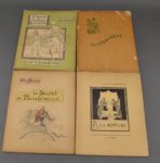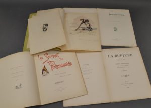 compositions par Robida. P., Floury, 1904. ARENE. Le secret de polichinelle. Enluminé par Robida. P., Floury, 1897. Tirage à 500 ex., celui-ci num sur vélin satin. UZANNE. La panacée du Capitaine Hauteroche. Imagée par Eugène Courboin. P., Floury, 1899. Ex sur papier imperial du japon, un dessin gouaché original avec envoi autographe signé de l’illustrateur. Un portrait de P. Arene. Les 4 fascicules :