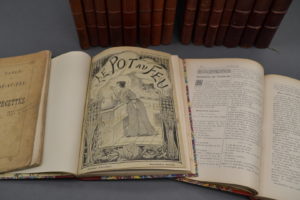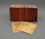 ; demi-maroquin rouge, dos à nerfs pour les années 1894-99 (3 volumes) ; demi-veau rouge, dos à nerfs pour les années 1900 à 1912 (13 volumes). La « table du Pot-au-feu » 1893-1902 est reliée en fin de volumes 1902. Joint un exemplaire de cette table broché, et 3 exemplaires brochés de la Table 1903-1907. Revue recherchée pour les recettes qu'elle contenait et aussi pour les articles concernant la mode. L'éditeur était Saint-Ange Ébrard. Chaque numéro contient une leçon de cuisine donnée par un chef, de nombreuses recettes, des menus et des articles divers. La plupart des feuillets publicitaires (paginés en chiffres romains) manquent. Petit manque à 2 feuillets publicitaires en 1908 (après la p. 224), les tables des matières sont reliées avant les 4 dernières pages pour les années 1908, 1909, 1911 et 1912.