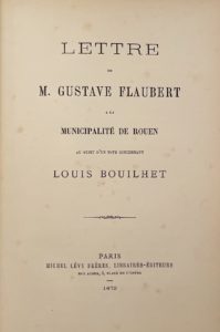 Édition originale de cette plaquette dans laquelle Flaubert fustige violemment les édiles « illettrés » de la municipalité de Rouen, qui avaient refusé d'édifier un monument à la mémoire de son ami Louis Bouilhet, décédé en 1869.