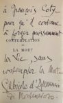 Envoi autographe signé de l'auteur à François Coty, pour qu'il continue à forger puissamment la Vie, sans contempler la Mort, Gabriele d'Annunzio di Montenevoso.
