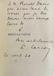 Exemplaire de l'auteur enrichi de cet envoi autographe signé à Ronald Davis, qui aime tant les livres que je lui donne mon exemplaire de → [Jésus-la-Caille]. Bien cordialement, Carco, 20 avril 20.