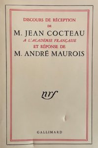 Édition originale du discours prononcé le 20 octobre 1955 par Jean Cocteau, élu au siège laissé vacant par Jérôme Tharaud, et de la réponse de Maurois.