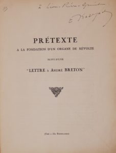 Envoi autographe signé à Léon Pierre-Quint (1895-1958), l’éditeur des surréalistes, à la tête des éditions du Sagittaire durant plus de vingt ans.
