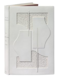 Paris, Jérôme Martineau, 1969. In-8, box blanc, décor composé de formes géométrique du même box mosaïquées en relief et des mêmes formes en réserve floquées d'éclats de coquille peints en blanc, dos lisse titré au palladium, doublure et gardes de daim rose, non rogné, couverture et dos, chemise et étui gainés de box gris (Alain Devauchelle, 1991).