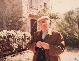 Beau portrait du poète, mains jointes, devant sa maison du Bar-sur-Loup.