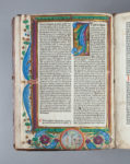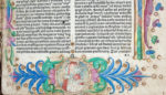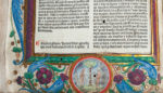 Au feuillet a2 et au verso du feuillet a4, L’INITIALE DE DEPART EST PEINTE SUR UN FOND DE FEUILLE D’OR et les marges sont ornées d’un encadrement doré avec ornements peints de diverses couleurs : la marge inférieure de ces deux pages est ornée d’UN MEDAILLON HISTORIE, l’un représentant le pape (portrait à demi effacé) et l’autre Adam et Ève.