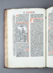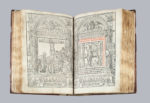 Imprimée en caractères gothiques rouge et noir sur deux colonnes, elle est agrémentée de lettrines ornées et illustrée de 10 grands et beaux bois à pleine page de forme architecturale.