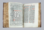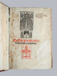 MISSEL VÉNITIEN. Missale predicatorum. S.l.n.d. [au colophon] : [Venise], Lucantonio Giunta, juillet 1504. Fort volume in folio, basane brune estampée à froid sur ais, plats ornés de filets et de deux grosses roulettes dessinant une bordure, le panneau central ainsi délimité orné d'un décor à répétition, restes de fermoirs et de liens, dos recouvert au XVIIIe siècle de peau de truie avec pièce de titre (Reliure de l'époque).