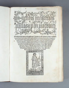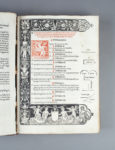 Titre en grandes lettres xylographiques avec marque de Tacuino au centre. Le feuillet A1 est encadré d'une belle et large bordure ornementée sur fond noir, et le texte est orné de très nombreuses figures géométriques.