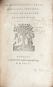 PALLADIUS. De re rustica libri XIIII. Paris, Robert Estienne, 1543. — MERULA (Giorgio). Enarrationes vocum priscarum in libris de Re rustica. Ibid. — VETTORI (Pietro). Explicationes suarum in Catonem, Varronem, Columellam castigationum. Ibid. — TACITE. Annotationes. Beati Rhenani, Alciati, ac Beroaldi. Lyon, Sébastien Gryphe, 1542. — TACITE. In Annalium libros. Lyon, Sébastien Gryphe, 1541. Ensemble 5 ouvrages en un volume in-8, veau brun estampé à froid, double encadrement de filets se croisant aux angles, plaque frappée au centre, dos à nerfs, doublure de feuille de vélin manuscrite (Reliure de l'époque).
