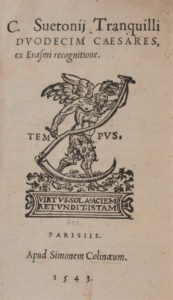 Troisième édition publiée par Simon de Colines de la Vie des empereurs romains de Suétone, avec les commentaires d'Érasme et d'Egnatius.