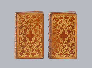 Un exemple très proche mais d'exécution italienne, sur le Cicéron imprimé à Venise en 1569, orné d'une plaque azurée à décor de feuillages et enroulements, est reproduit par Hobson et Culot dans La reliure en Italie et en France du XVIe siècle, 1991, n°20.