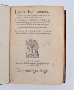 BAÏF (Lazare de). Annotationes in L.II. De captivis… de Re navali… De auro & argento leg. quibus Vestimentorum & Vasculorum. Paris, Robert Estienne, 1549. 2 parties en un volume in-4, veau fauve, double encadrement de trois filets à froid, petit fleuron doré aux angles, médaillon au centre à décor d'entrelacs sur fond azuré, dos orné (Reliure de l'époque).