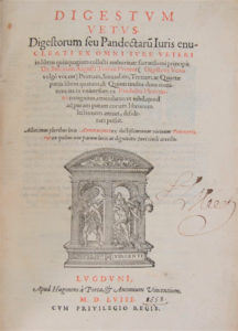 Premier volume seul (sur six) de cette édition lyonnaise du Corpus juris civilis, importante anthologie de textes de droit romain rassemblés ou promulgués au VIe siècle sous le règne de l'empereur Justinien Ier.