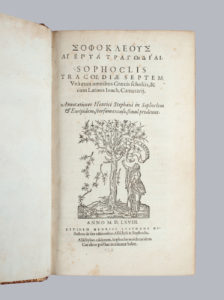 Importante édition, contenant les scholies compilées au XIVe siècle par le philologue byzantin Demetrius Triclinius, corrigées par Henri Estienne, les commentaires de Joachim Camerarius et la traduction latine par le même des tragédies Ajax et Électre.