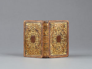 SALLUSTE. Conjuratio catilinae, et Bellum Iugurthinum. Lyon, Antoine Gryphe, 1570. In-16, veau fauve, encadrement orné de filets dorés et d'un listel brun, plaque dorée et rehaussée de cire bleue à décor d'enroulements et rinceaux sur fond azuré, le centre laissé en réserve, dos lisse orné, tranches dorées (Reliure de l'époque).