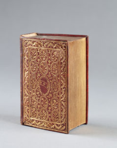 FLAVIUS JOSEPHE. Opera. [Genève], Jacob Stoer, 1595. In-16, maroquin rouge, encadrement sur les plats et le dos d'une bordure de feuillages, les champs occupés par un grand semé de médaillons ovales de feuillages contenant chacun une fleur, armoiries au centre, filet sur les coupes, tranches dorées (Reliure de l'époque).