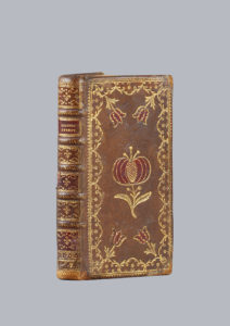 ALMANACH. Nouvelles étrennes spirituelles dédiées à Monseigneur le Dauphin. Paris, Louis-Guillaume de Hansy, 1768. Petit in-12, maroquin vert olive, petite dentelle dorée, tulipe dorée et mosaïquée de rouge aux angles, au centre fer floral (grenade) doré et mosaïqué de rouge, dos orné, pièce de titre rouge, roulette intérieure, doublure et gardes de papier doré à motifs floraux, tranches dorées, boîte-étui vers 1900 (Reliure de l'époque).