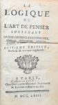 Impression en petits caractères de la huitième édition de la Logique de Port-Royal « due entièrement au hasard et plutôt à une sorte de divertissement » (Préface). Page 123 mal imprimée.