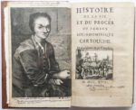 - 1. Histoire de la vie et du Procès du Fameux Louis-Dominique Cartouche et de plusieurs de ses complices. Sans lieu ni nom, 1723. [2]-105 pages. Portrait de Cartouche (détail d'une gravure), titre avec une vignette collée, (scène de l'exécution), 1 portrait, 2 gravures dépliantes (L'école du diable Busenbaum et Cartouche dans son cachot), 1 gravure (Homo homini lupus), 15 pages manuscrites concernant Cartouche.