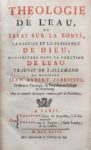 Ouvrage singulier dans lequel l'auteur veut faire connaître l'utilité de l'eau, le besoin absolu que les créatures en ont et combien elle sert aux besoins et aux commodités de l'homme ; il est divisé en 3 livres : De la nécessité de l'eau, de sa nature, de sa quantité (Profondeur de la mer et des fleuves, du mélange avec d'autres substances,..) De la sage et libérale dispensation des eaux dans le Monde (L'eau qu'il y a sous la terre, de l'usage de l'eau par les hommes et les animaux,...) Du mouvement des eaux (Gouffres, du flux et du reflux, les plantes au-dessus et au-dedans de l'eau,...). Seconde édition traduite de l'allemand par le docteur Burnand. Importante restauration ancienne sur un plat, (Quérard III, 966).