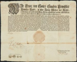 François Ier (1708-1765) Empereur. P.S., Vienne 7 février 1760 ; contresignée par le comte Joseph de COLLOREDO et Johann Georg REIZET ; in-plano imprimé, grand sceau aux armes sous papier ; en allemand.