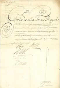 Ordre au Garde du Trésor royal Pierre Gruyn de payer au S. de VEDRILLE «la somme de six cent livres, pour une année de la pension que je luy ay accordée en consideration de ses service, et pour luy donner moyen de subsister chés luy». Le secrétaire de la main a signé «Louis», et le Roi a confirmé de sa main : «bon Louis».