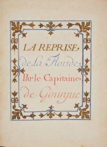 [MANUSCRIT]. [FLORIDE]. [GOURGUE (Dominique de)]. La Reprise de la Floride par le capitaine de Gourgue En français, manuscrit sur papier France, XVIIIe siècle. 60 ff., précédés et suivis de 3 ff. de papier, complet, écriture cursive à l'encre brune, titre manuscrit à l'encre dorée, bleue et rouge dans un encadrement ornemental doré et bleu.