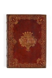 Reliure de maroquin rouge du XVIIIe siècle, dos à cinq nerfs cloisonné et fleuronné avec en alternance la croix de Lorraine et la tour de Turenne, lettrage doré, dentelle dorée aux petits fers, armoiries au centre, aux angles des plats la croix de Lorraine et la tour de Turenne, roulette intérieure, double filet doré sur les coupes, gardes de tabis bleu, tranches dorées (Bel état général, dorure légèrement passée ; bel état intérieur).