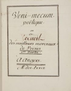 [MANUSCRIT]. [POÉSIE]. [CHANSONS]. Veni-mecum poëtique ou Recueil des meilleurs morceaux de Poësies. 1ere [- 2eme] partie. A Angers, MDCCLXXIX [1779]