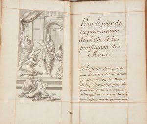 Avec un dessin : plume, encre noire et lavis d'encre noire sur papier (attribué à Gravelot) France, XVIIIe siècle 257 pp., précédés de 6 ff. de papier et suivis de 11 ff. de papier, écriture cursive à l'encre brune, texte inscrit dans un encadrement au liseré à l'encre rouge pâle, dessin placé en frontispice, figurant la Présentation de Jésus Christ (Circoncision ; fête de la Purification de Marie le 2 février).