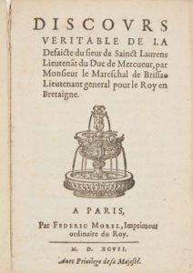 [BRETAGNE]. BRISSAC, Maréchal de. Discours véritable de la Defaicte du Sieur de Sainct Laurens Lieutenat du Duc de Mercueur, par Monsieur le Mareschal de Brissac Lieutenant general pour le Roy de Bretaigne. Paris, Frederic Morel, 1597. 1 plaquette petite in-8. Broché, couvertures de papier marbré XIXe. 8pp.