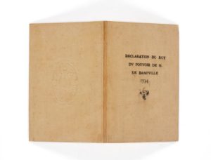 Déclaration du Roy, du pouvoir de Monsieur de Dampville, Admiral de France. Paris, Jamet Mettayer, & L'Huillier, 1596. 1 plaquette petit in-8. Cartonnage beige, titre en noir sur le premier plat, fleuron à froid au second plat. [BENRENDS?]. 12pp.