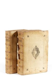 FONTANON, Antoine. Les Edicts et ordonnances des Roys de France depuis S. Loys jusques à présent. Paris, Michel Sonnius, 1585. 2 vol. in-folio. Plein vélin d'époque, écusson noir au centre des plats, filets à froid en encadrement avec petits fleurons d'angle, dos à nerfs orné de motifs en noir, titre et tomaison en noir.