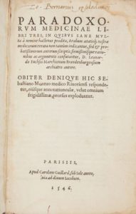 FUCHS, Leonhart. Paradoxorum medicinae libri tres, in quibus sane multa a menine hactenus prodita (...) Paris, Charlotte Guillard, 1546. 1 vol. in-8. Veau d'époque, dos à nerfs. [20]ff, 220pp.