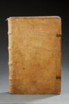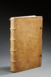 Taches et trous de vers sur les plats, manque la coiffe supérieure, les lanières d'attache, usures d'usage aux coupes et aux coins. Traces d'ex-libris au contreplat.