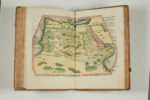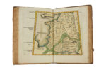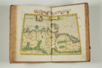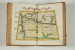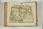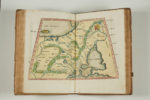 Remarquable suite de 50 cartes en double page (sauf une simple au dos d'une double) en coloris d'époque : cartes du Monde, de l'Amérique, de l'Asie, de l'Afrique, de l'Europe, de la Crête, de la province rhénane, de l'Alsace et de la Lorraine, de l'Angleterre, de l'Espagne, etc. Les cartes sont gravées sur bois.