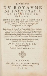 CONTESTAGGIO, Heronimo de Franchi - NARDIN, Th. L'Union du Royaume de Portugal à la couronne de Castille. Arras, Gilles Bauduyn, 1600. 1 vol. in-8. Plein veau granité brun, armes dorées au centre des plats, dos à nerfs orné, pièce de titre de maroquin rouge. [12]ff, 598pp, [1]p.