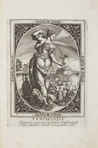 - Suite de sept gravures de Sébastien Leclerc concernant les sept vertus cardinales, titrées, légendées et portant un encadrement ornemental avec décor floral dans les angles.